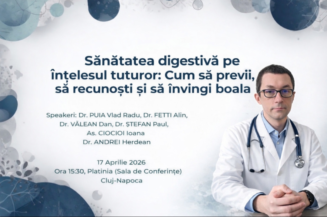 Un eveniment dedicat sănătății digestive va avea loc în 17 aprilie 2026, de la ora 15:30, la Platinia – Sala de Conferințe din Cluj-Napoca, reunind medici specialiști care vor aborda, într-un limbaj accesibil, cele mai frecvente probleme și soluții din acest domeniu.